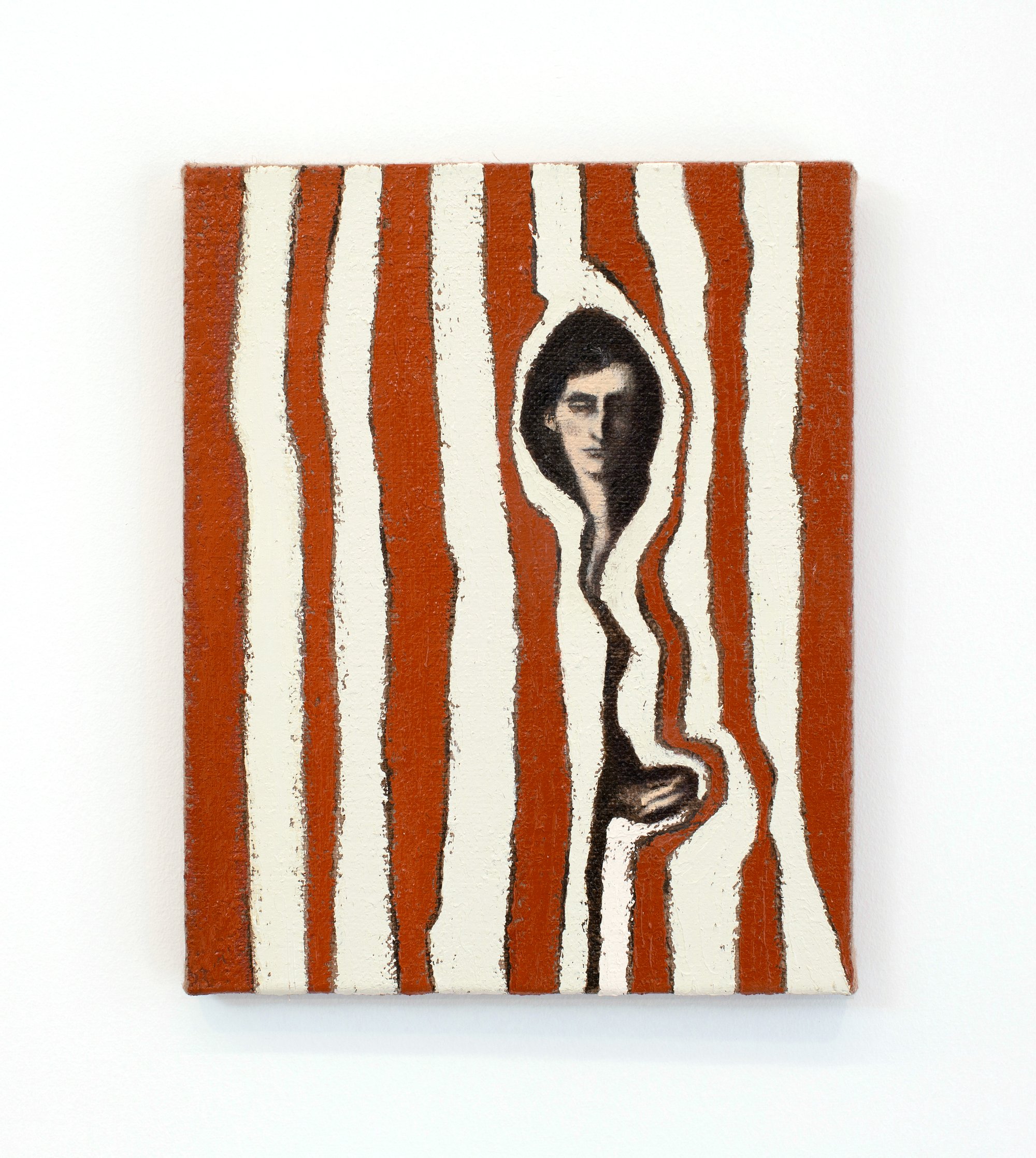 In 'A Bad Case of the Stripes',a young man peers through a striped curtain spanning the entire picture plane, seemingly pushing through the painting itself and staring out, half-hidden from a waiting world. Capturing the precarity of liminality and the sheer strangeness of being in-between, Kozak materializes the disorientation of the precipice.